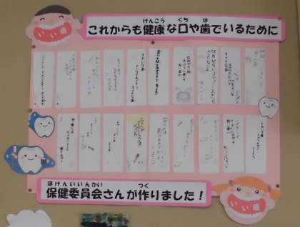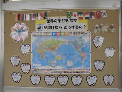 1つ目は、昨日の保健委員会で「これからも健康な歯や口でいるために」をテーマに標語を考え、保健室の中に掲示しています。2つ目は、保健室前に「世界の子どもたち 歯が抜けたらどうするの?」という掲示物を掲示しています。