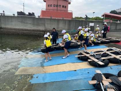 いかだの乗り方の説明を聞いています。乗る場所やタイミングを間違えると、いかだが傾いて沈んでしまうのでとても難しそうです。