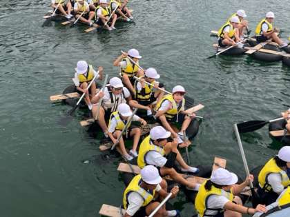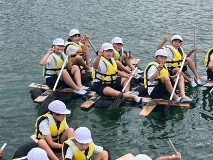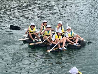 上手にいかだに乗れています。海の上で不安定なところですが、笑顔を見せてくれました。