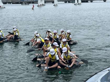 海に投げ込まれたボールをみんなで力を合わせて拾っています。思うようにいかだが動かず苦戦しています。