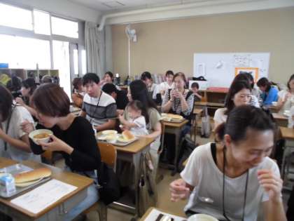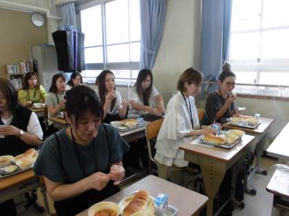 給食試食会がおこなわれました。令和元年以来4年ぶりの試食会でした。まだ前を向いて給食を食べています。7月7日(金)の献立はコッペパン 牛乳 トマトポークシチュー 野菜ソテー プトでした。プトはフィリピンの蒸しパンでした。トマトポークシチューは小麦アレルギーの児童も食べられるルウを使わないシチューでした。試食会では、「人参マン」「魚には骨がある」「おはし」「豆豆音頭」を歌いました。給食の放送では「君は何を飲む」「堺の恵み」「給食当番のきまり」「廊下歩行の歌」を歌いました。