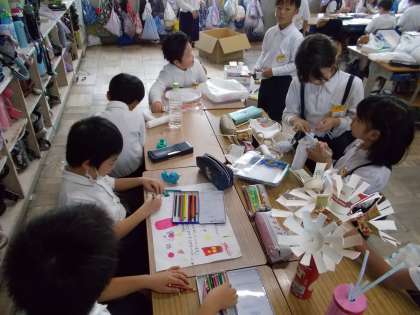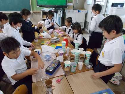 ペットボトルや段ボール、紙コップなどを使って、グループでそれぞれおもちゃを作っています。ペットボトルボーリングや紙コップけんだまなど楽しそうなおもちゃがたくさん出来上がってきています。完成してみんなで遊ぶのが楽しみですね。