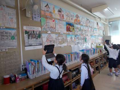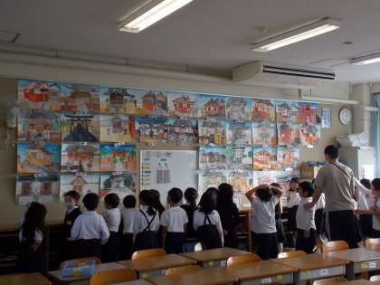 6年生は田守神社を描きました。鑑賞していた2年生から「すごい!」と思わず声が出るほど、細かく丁寧に描かれた作品ばかりです。
