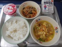 1月26日(金)の献立はコッペパン 牛乳 カレーシチュー ホットサラダでした。食べキリン週間の最終日でした。みんなよく頑張って食べてくれました。「感謝をこめていただきます」「食べキリン音頭」「堺の恵み」「ポケットから手を出そう」を歌いました。
