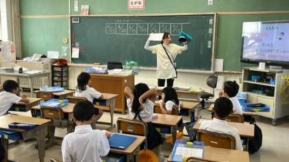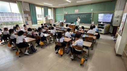 1年生は明日から水泳が始まります。はじめての水泳なので、担任の先生が詳しく持ち物の話をしていました。