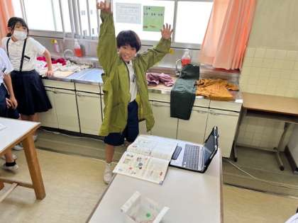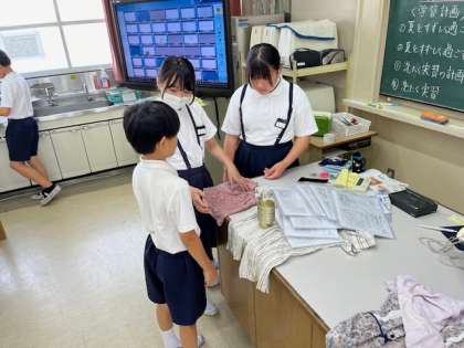 夏を涼しく、快適に過ごすための着方について考えました。子どもたちはいろいろな布地を触ってみたり、濡らしてみたり、実際に着てみたりしてその性質を調べていました。