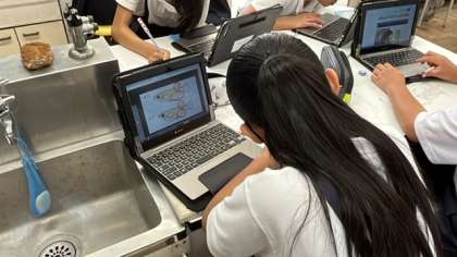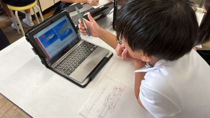 メダカのオスとメスの違いについてタブレットを使って調べて、ノートにまとめていました。ノートには文だけでなく、絵も使って上手に表していました。