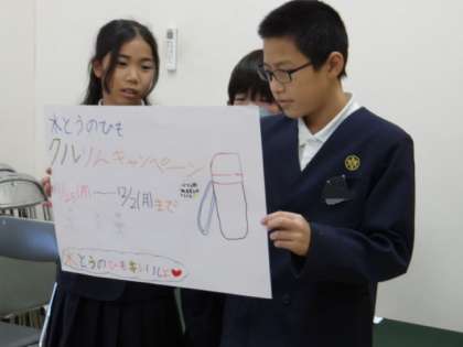 美化委員会からは「水筒のひも、クルリンキャンペーン」