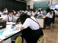 3組の教室の前で、一人ずつ写真を撮っていました。