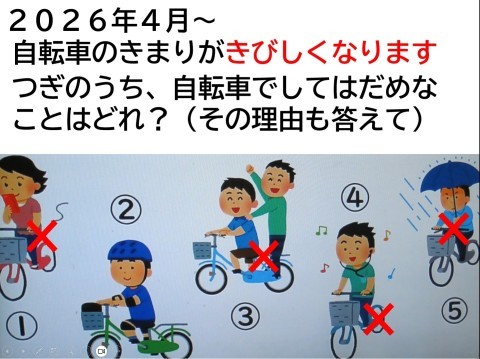 今日の全校朝会では、9月21日(日)から9月30日(火)まで行われている「令和7年度秋の全国交通安全運動」と来年4月から交通違反に対しての制度等の適用で厳しくなる自転車のきまり(ルール)について、生徒指導の岡田先生と代表委員の3名によるクイズ形式で確認しました。