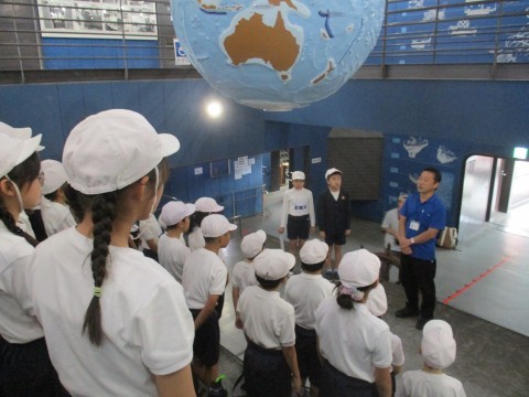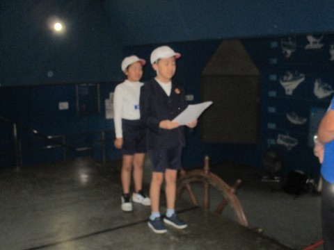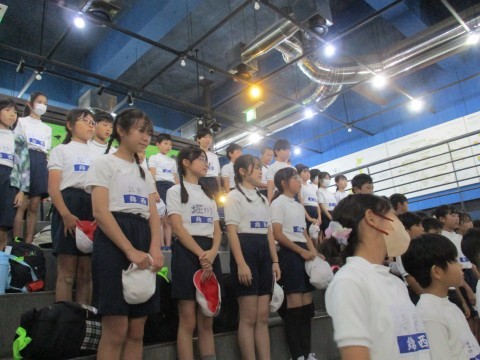 大阪府立青少年海洋センターに到着、入所し、本校実行委員のあいさつとセンターの方からのお話を聞いている様子です。