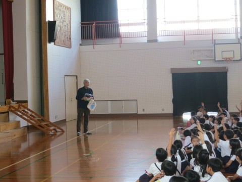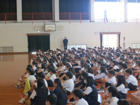 今日10月15日(水)の全校朝会では、錦西校区自治連合協議会会長の西村、民浩様から防災に対する備えと子どもたちが暮らす地域の特徴についてお話をいただきました。