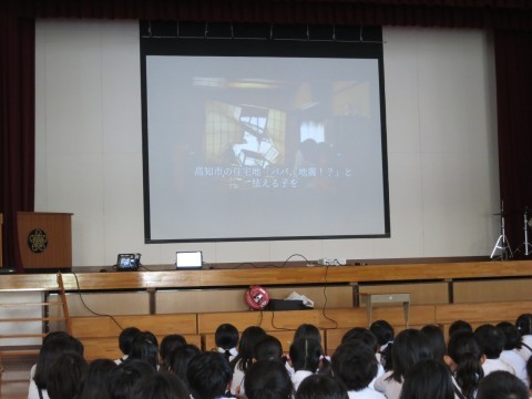 子どもたちは南海トラフ巨大地震の発生を想定したシミュレーション動画とクイズにより、もし発生したらどのような行動をどのくらいの時間でしなければならないのか、そして避難場所を決め、家族との避難場所での待ち合わせ方法を決めておくことの必要性をしっかりと確認していました。