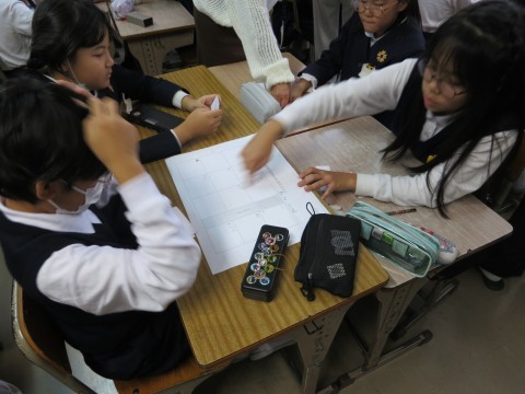 「聴き方名人になろう」と題し、目で「相手の方を見て聴く」、耳で「話の内容を聴く」、心で「相手が何を伝えたいのか聴く」ことができるようになるよう、情報カードを使って、錦西小学校の先生ばかり住んでいるマンションには、だれがどこに住んでいるか、情報を目、耳、心で聴き,、部屋ごとの住人を探っていくグループワークを行いました。