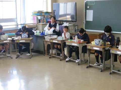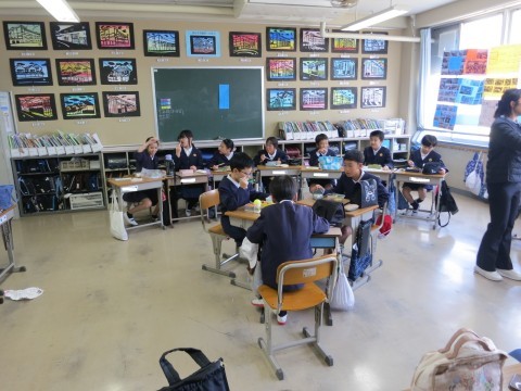 フェニーチェ堺への移動前に、教室で保護者の皆さんに作っていただいたお弁当を食べたり、