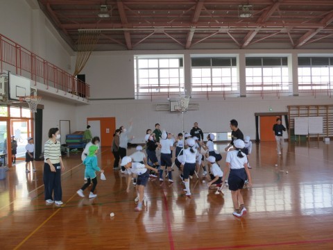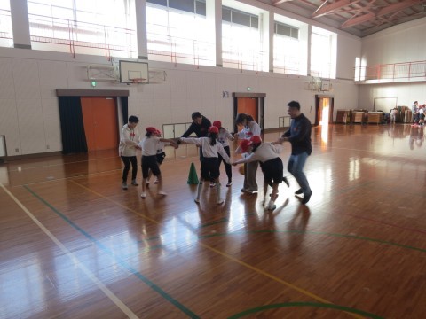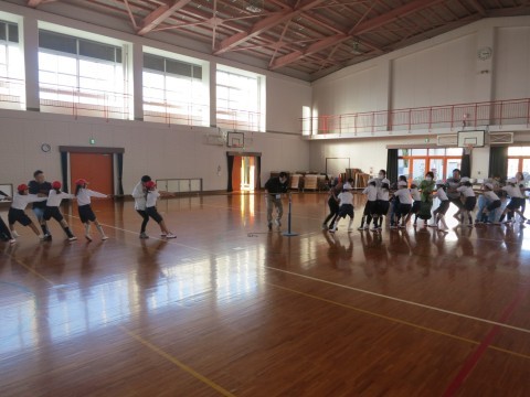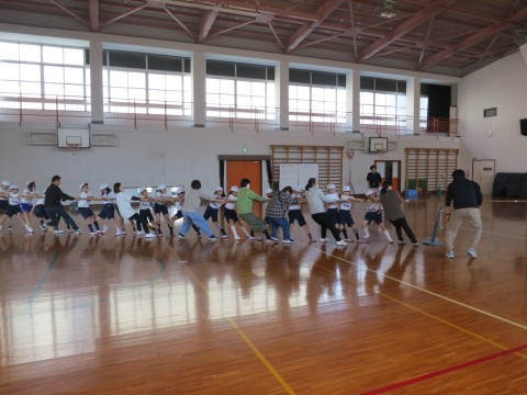最初に、しっぽ取り鬼ごっこでウォーミングアップした後に、チェッコリ玉入れ、手つなぎドリブルリレー、綱引きの3種目を、親子混合の紅白の2チームに分かれて行いました。
