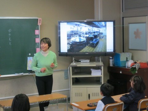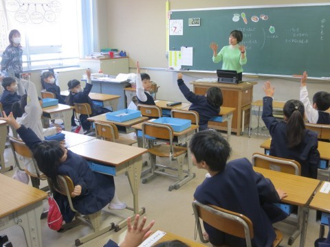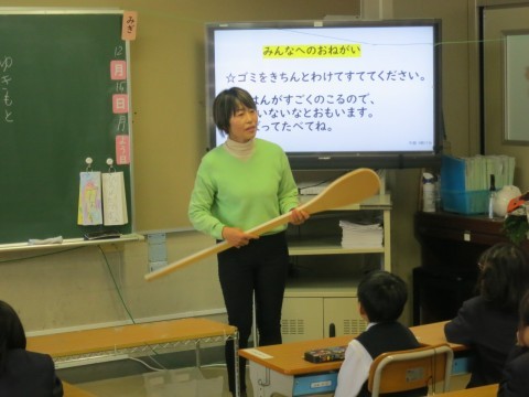 12月15日(月)、三宝小学校の栄養教諭の先生に来ていただき、1年生に向けて、給食についての食育授業を実施しました。