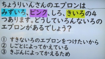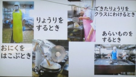 特に、給食の調理員さんのエプロンがみずいろ、ピンク、しろ、きいろの4色あること、ヘラや調理器具の大きさを実物や写真で初めて見て、知り驚いていました。