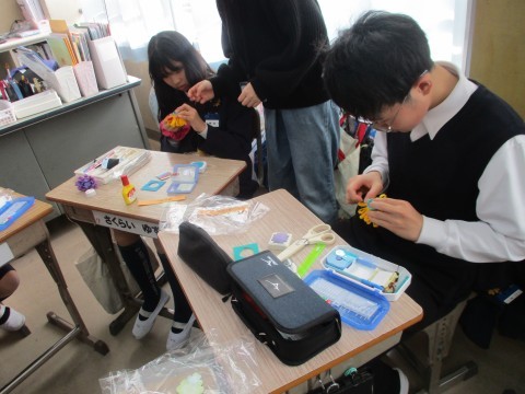 今回の交流会では、6年生が卒業式で胸につけるコサージュ作りを行いました。