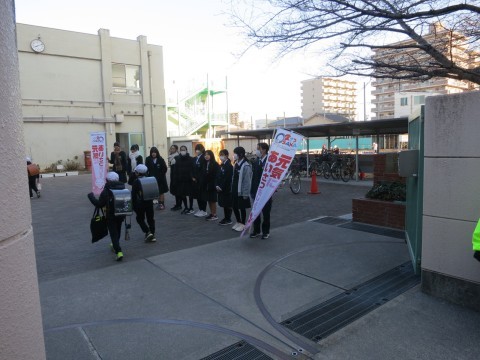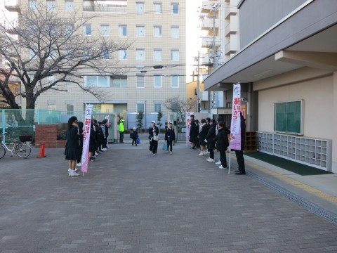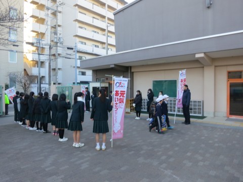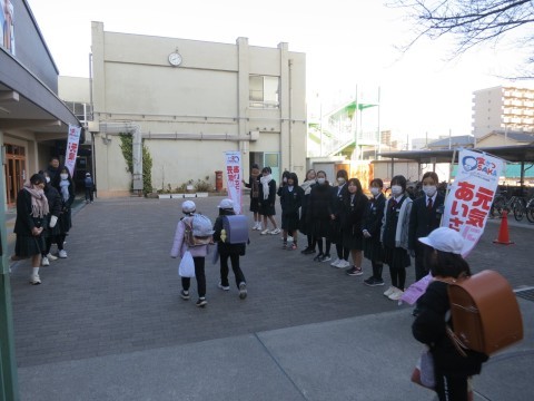 2月9日(月)の登校時に、月洲中学校のお兄さん、お姉さん方が、校門前でのあいさつ運動に来てくださいました。