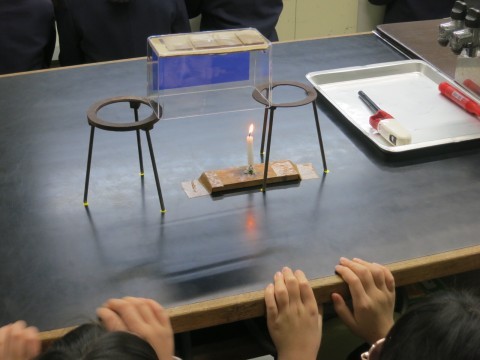 今回の授業は、校内の公開授業として位置づけし、空気のあたたまり方を「見える化」するために教員が工夫した点(観賞ケースを実験の教材として加工し、室内の空気のあたたまり方を「見える化」)などを校内の教員とも共有しました。