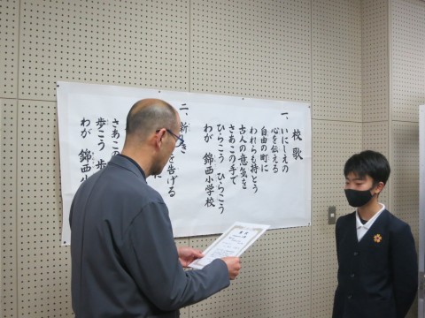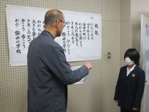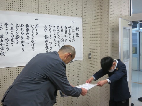 2月25日(水)の全校朝会では、堺市学校保健会主催、第16回健康啓発標語コンクールでの入選者の表彰を行い、6年生児童1名と5年生児童2名に校長先生から賞状が授与されました。