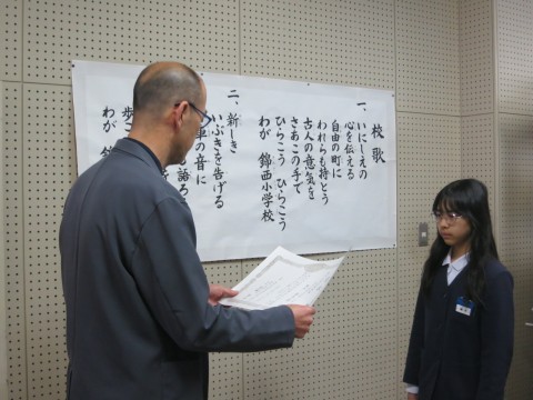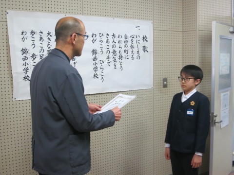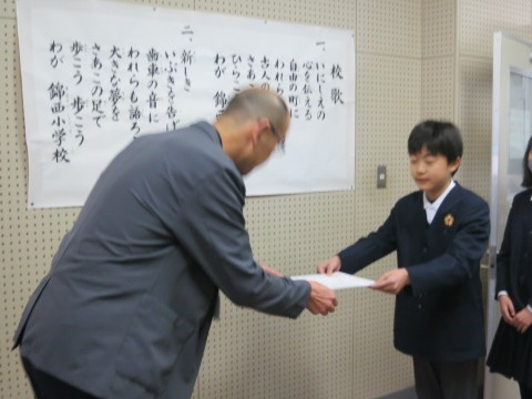 2月26日(水)の全校朝会では、堺市小学生絵画展、第75回堺市こども市展絵画の部の入賞者の表彰を行い、代表して堺市小学生絵画展で入賞した6年生児童と第75回堺市こども市展絵画の部で入賞した6年生児童の2名に校長先生から賞状が授与されました。