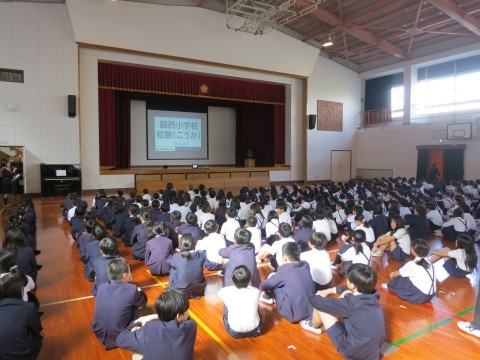 今回の全校朝会では、校長先生から校歌の歌詞の一語一語がどのような意味を持っていて、どんな背景があるのかのお話があり、錦西小学校のことや錦西の地域や歴史のことをよく知ることができました。