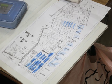調べた後は、住宅が多いところなど調べて見えてきた特徴を校区の白地図に色を塗り、仕分けをしました。