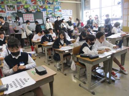 10月28日(土)4年生「土曜参観」 公開日 2023/10/28 更新日 2023/10/28 4年生 4年生の参観授業は算数でした。ドットが並んでいる図を見て、ドットが何個あるか、一つの式に表し答えを求めました。 式は同じでも分け方は何通りもあることに気づきました。友達と分け方を説明し合っていました。