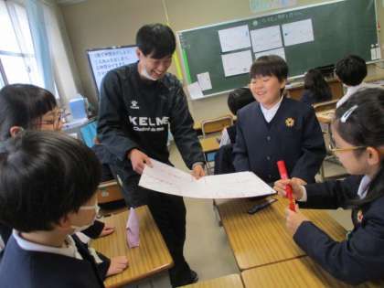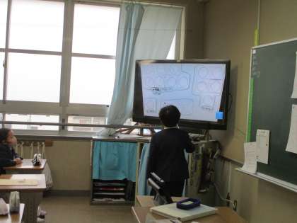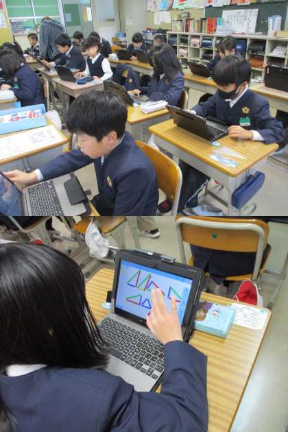 1月10日(水)3年生「三角形と角」 公開日 2024/01/10 更新日 2024/01/10 3年生 パソコンを使って色の棒3本を組み合わせて、色々な三角形を作ったり、辺の長さに目をつけて三角形の仲間分けをしたりしました。