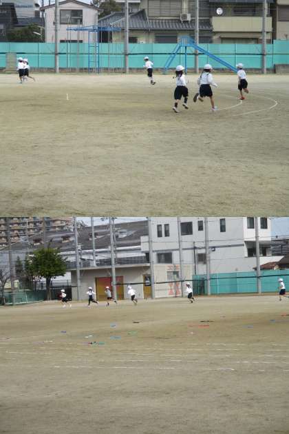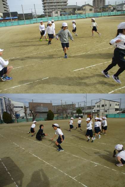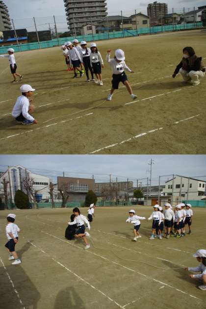 1組は、運動場での体育です。3分間の駆け足をした後、長縄を使ってのなわとび遊びをしました。