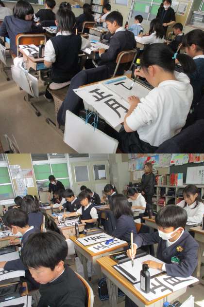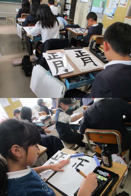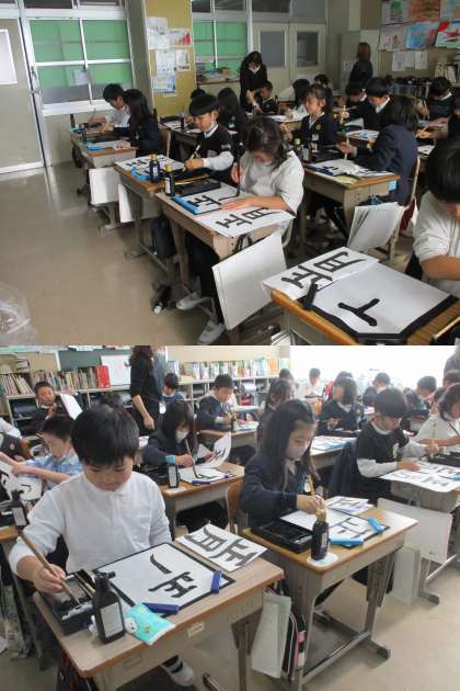 1月11日(木)3年生「書き初め」 公開日 2024/01/11 更新日 2024/01/11 3年生 書写の授業で書き初めをしました。今まで学習してきた、たて画・横画の筆使いや、曲がりとおれ・はらい・はねに気をつけて「正月」を書きました。 静謐な環境の下、どの子も集中して書いていました。