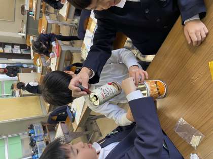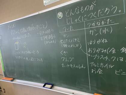 「鉄に引きつけられる」「缶はスチールとアルミがあり、アルミには引きつけられない」ということがわかりました。(1/11の授業)