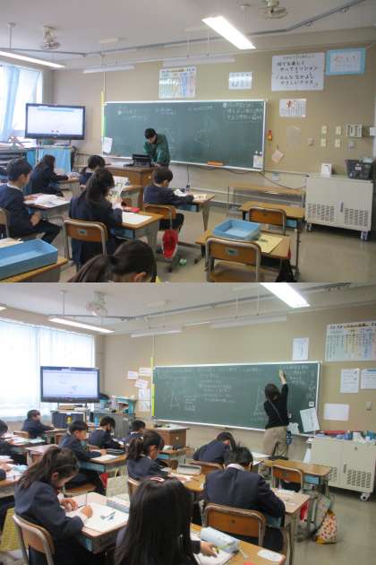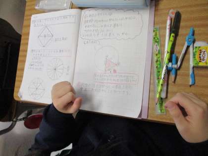 1月16日(火)3年生「三角形と角」 公開日 2024/01/16 更新日 2024/01/16 3年生 今日は、円と半径を使ってかくことのできる三角形について調べました。 円を使って、円のまわりの2つの点と中心を結ぶと、二等辺三角形や正三角形がかけることがわかりました。