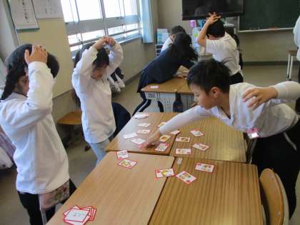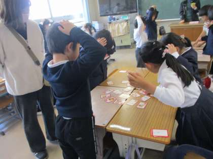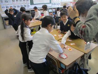 今日は班でカルタ遊びをしました。字札を読む人は先生です。たくさん絵札をとれたかな?