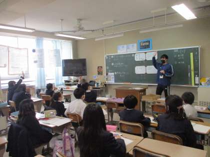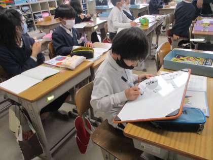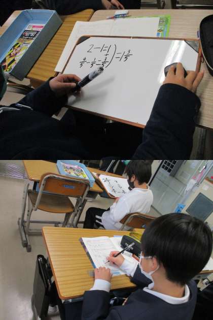 1月22日(月)4年生「分数」 公開日 2024/01/22 更新日 2024/01/22 4年生 今日の算数は、分母が同じ帯分数のたし算やひき算はどのように計算すればよいか考えました。 帯分数を整数部分と分数部分に分けて計算したり、帯分数を仮分数に直して計算したりしている子がいました。