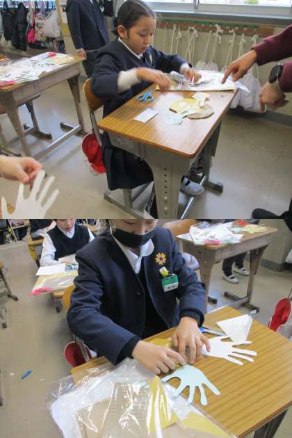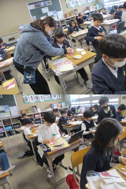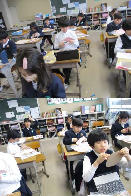 図工では、自分の顔をいろいろな材料で版を作り、材料や形を組み合わせて紙版画を行います。自分の顔をタブレットで写し、色々な紙を切ったりちぎったりして版を作っていきました。