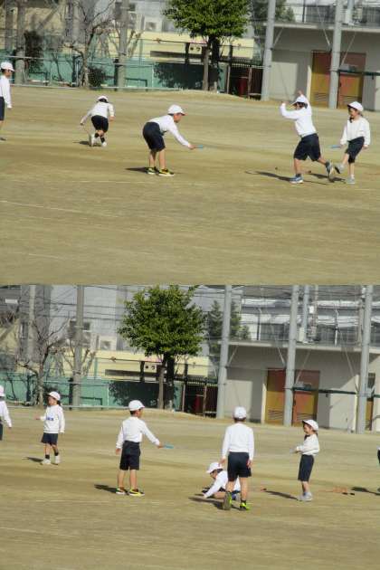 今日の体育は、駆け足で体を温めたあと、3人組になってなわとび遊びをしました。縄を持つ人を交代しながらいろいろな跳び方で遊びました。