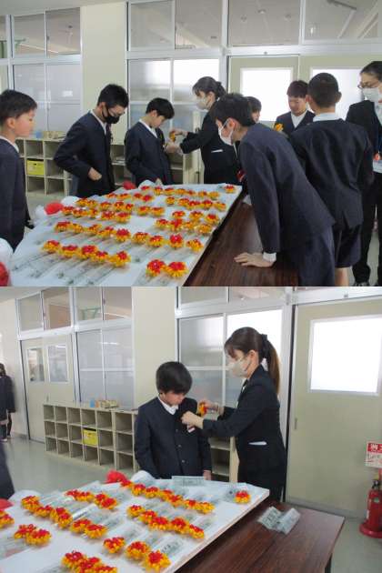 3月18日(月)『卒業式』〜1 公開日 2024/03/18 更新日 2024/03/18 学校行事 朝、子どもたちが登校してきました。手作りのコサージュを胸に着けてもらっていました。 いよいよ卒業式が始まり、卒業生が入場してきました。