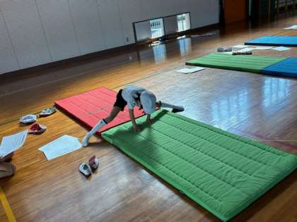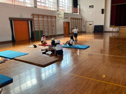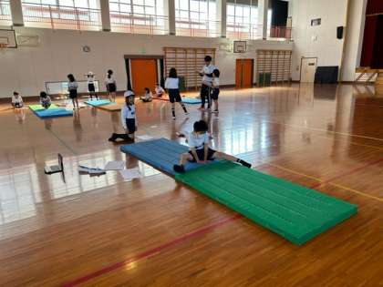 マット運動では、前転と後転の練習をしてきました。 今日は、「つなぎ技」を考えて、組み合わせ技に取り入れるために各グループでお互いにアドバイスを出し合って意欲的に取り組んでいました。