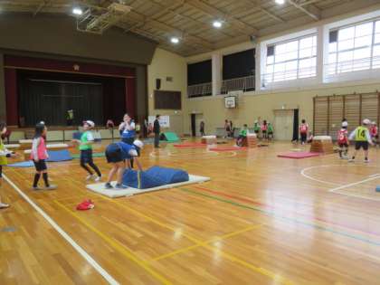 「跳び箱運動」の学習です。いろいろな場を使って「台上前転」のまとめをしました。
