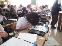 「いろいろな意味をもつ言葉」の学習のようすです。「みる」「たてる」などを使った文をつくり,PCを使って言葉の意味を調べました。
