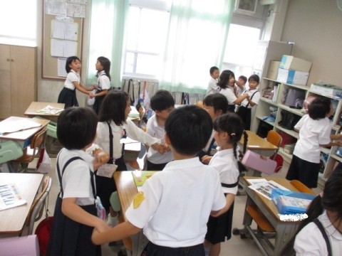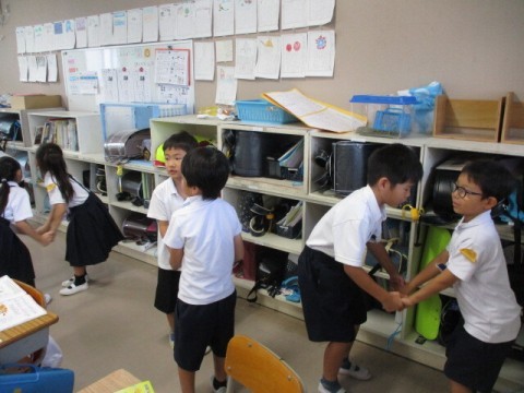 音楽の学習では,ペアやグループになって,音の高さを体で表現しています。