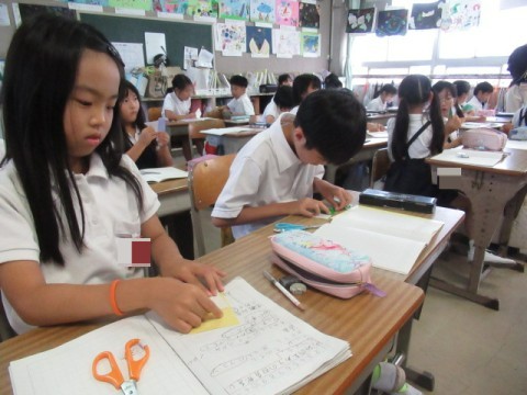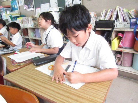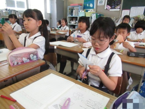 折り紙を切り、できた形を調べました。