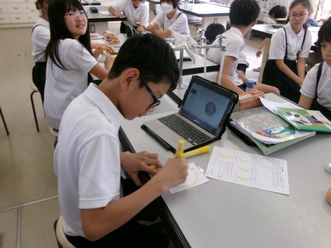 月の満ち欠けの学習をしています。夏休みに観察できなかった日の月を描きました。