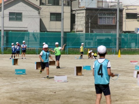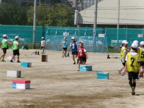 ハードル走をしています。リズミカルに走るコツを見つけるために,グループで見合いました。