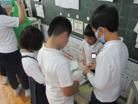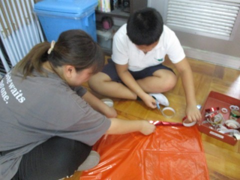 今日の朝の会は前回に出来上がった衣装の飾りつけをしました。テープやシールなどを使って、オリジナルの衣装を各々で作りました。