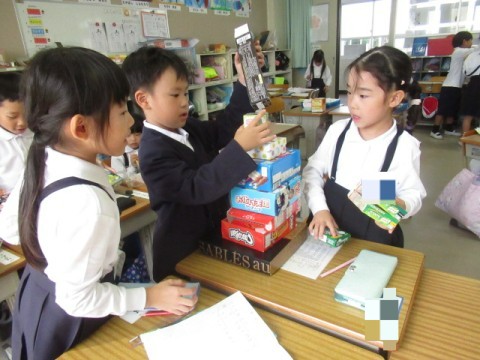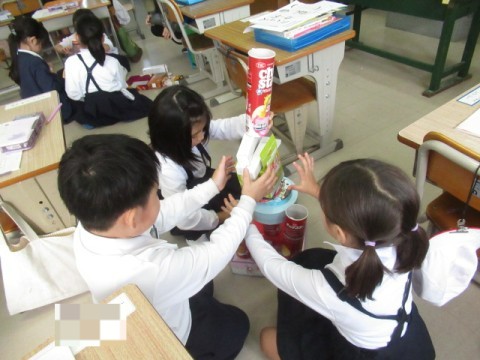 「かたち遊び」をしました。グループに分かれて、いろいろなものを作りました。