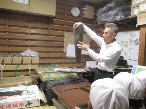「堺の伝統産業」の一つの昆布について、近くのこんぶ屋さんに見学に行きました。昆布を作っているところを見たり、堺の昆布の歴史について教えてもらったりしました。